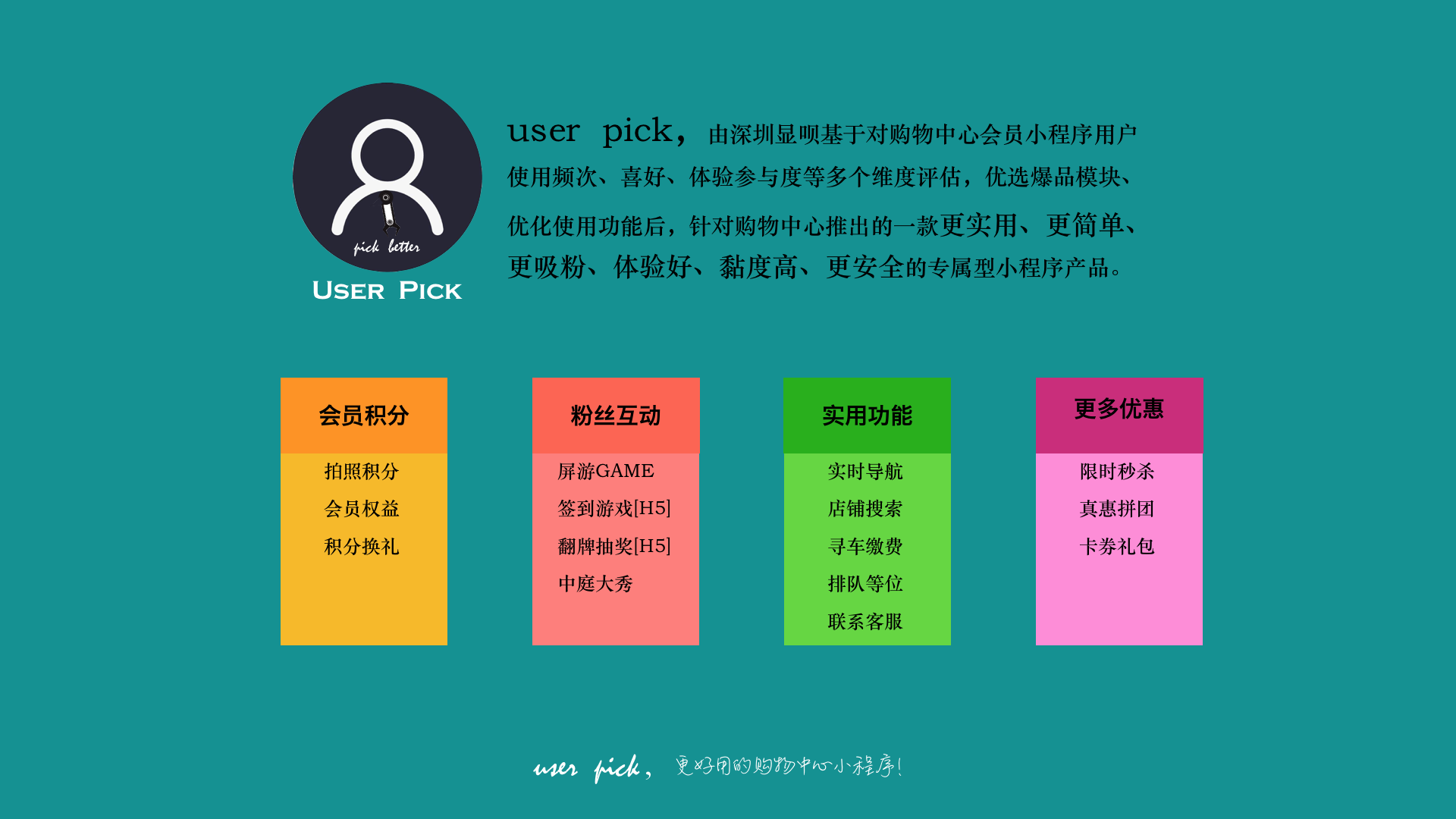 全景电子商务公司推出的“显呗”和“iU电竞”系列双屏多人游戏活动,聚焦线下大型卖场的运营、获客与CRM一体化服务。我们深入新零售领域数字化工具的开发,产品涵盖会员管理系统、AI自助积分、地磁场内导航、人流识别、动线优化等购物中心全面数字化管理工具。“显呗”和“iU电竞”是购物中心日常运营、会员活跃工具与CRM领导品牌。 “显呗”和“iU电竞”系列线下卖场运营管理工具,自2017年产品正式对外发布以来,获得业界一致好评。目前,全国共有三万平以上大型卖场7000多家,我们的销售网络覆盖其中1/3,长期年费客户累计超过300家。 | |||||||