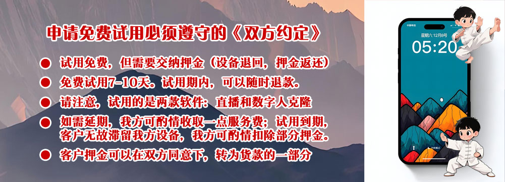 试用后,对效果不满意的客户需尽快将手机返还我方——无故滞留我方测试设备,并且没有正当理由的,我方可酌情扣除押金。用户希望延长试用期限,也可以向我方申请。试用一个月以上的,我方可以酌情收取部分服务费(因为我方会提供更多素材制作和现场拍摄的指导,同时客户也可能会产生直播销售佣金),具体金额由双方协商。